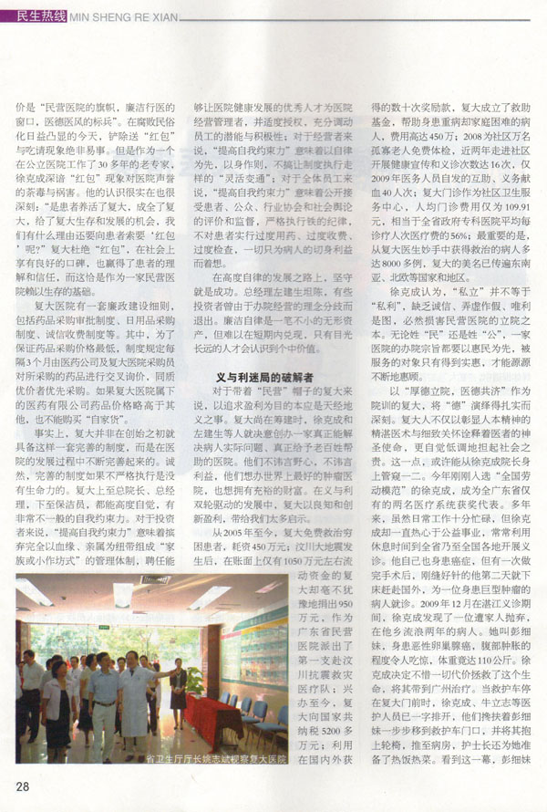文章从“自律发展的践行者”、“义与利迷局的破解者”、“民营医院创新的探路者”三个角色诠释了复大医院的成长历程以及对社会产生的积极启示。