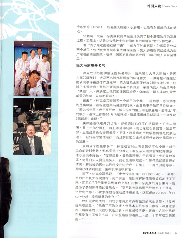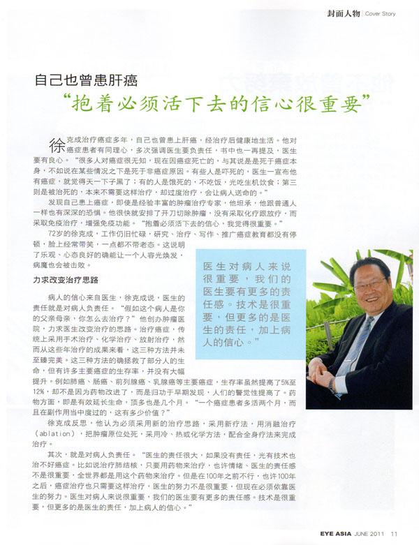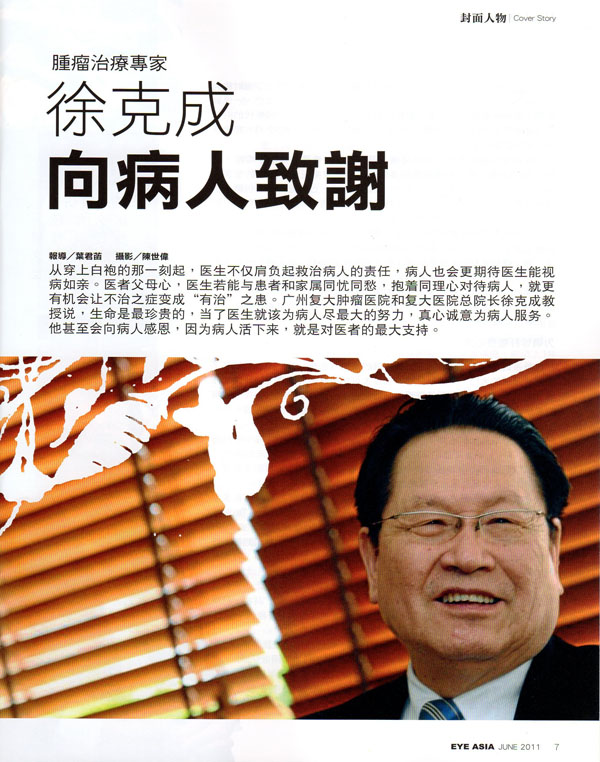 徐克成总院长登上马来西亚杂志《亚洲眼》2011年第63期封面人物,该期杂志以“肿瘤治疗专家徐克成向病人致谢”为标题,介绍了徐克成教授的经历、挑战、责任感等。