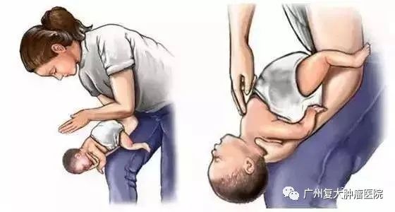用单手前臂托起孩子,用拇指和食指拖着孩子下颌,让患儿面部、气道朝下,头低脚高位,用手掌根部连续叩击肩胛骨连线中点处5次;