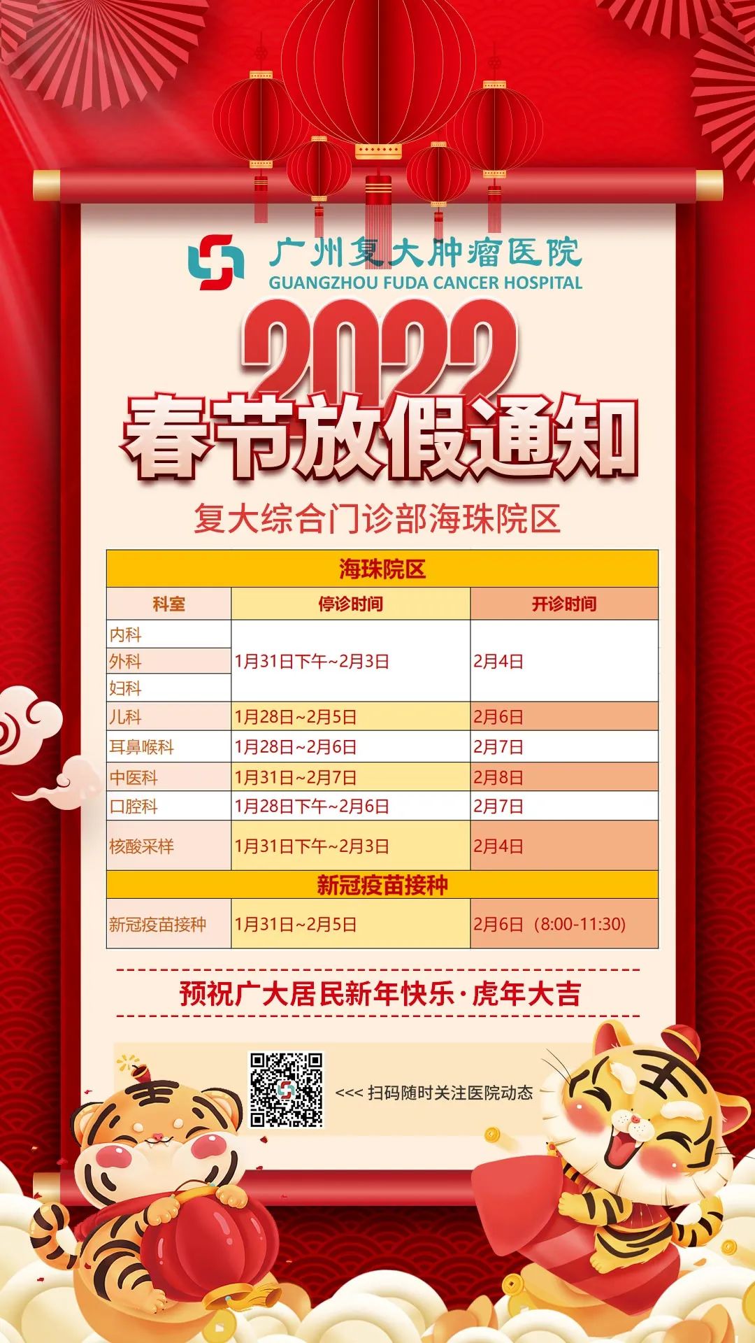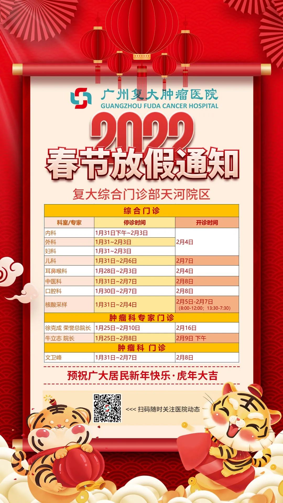 【重要】广州复大肿瘤医院2022年春节假期门诊服务安排