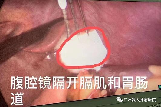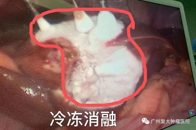 “肿瘤上面是膈肌,下面是胃,这种情况是无法热消融的。这种情况,腹腔镜的精确引导准确锁定肿瘤组织,把膈肌和胃拉开,暴露肿瘤位置,再进行冷冻消融比较安全。”牛立志院长解释道,冷冻消融治疗重复的冷冻-复温过程可有效杀灭肿瘤细胞、微血管内膜损伤并栓塞、逆转肿瘤免疫抑制状态,达到较好控制肿瘤进展的目的。