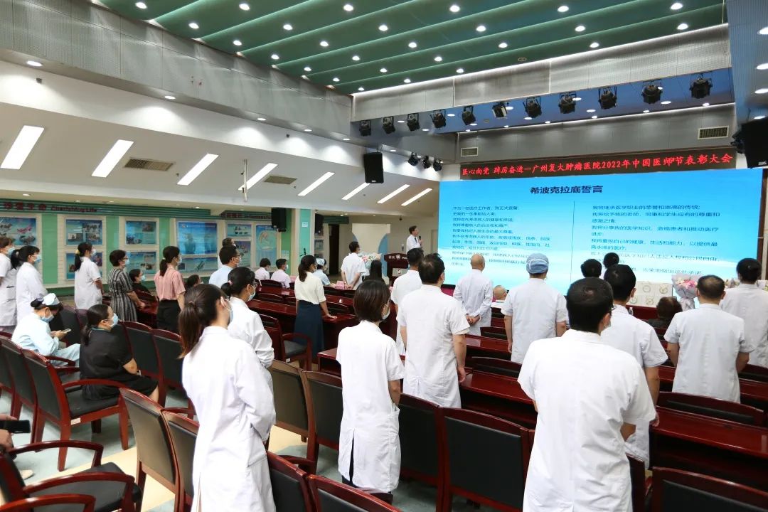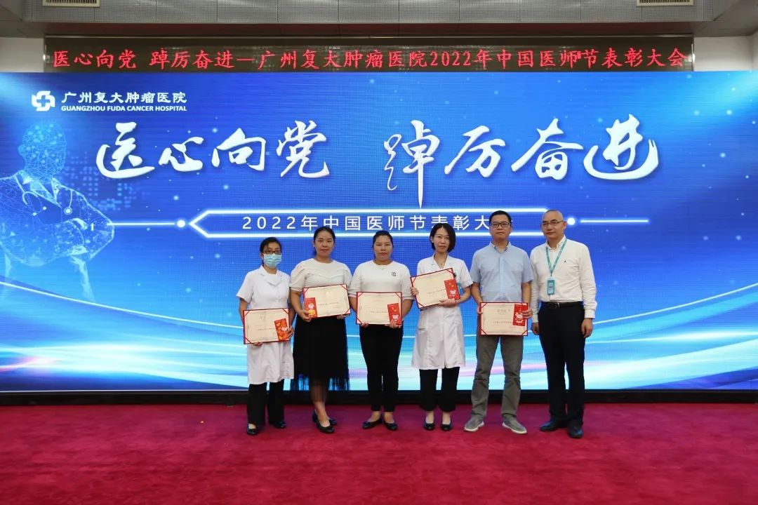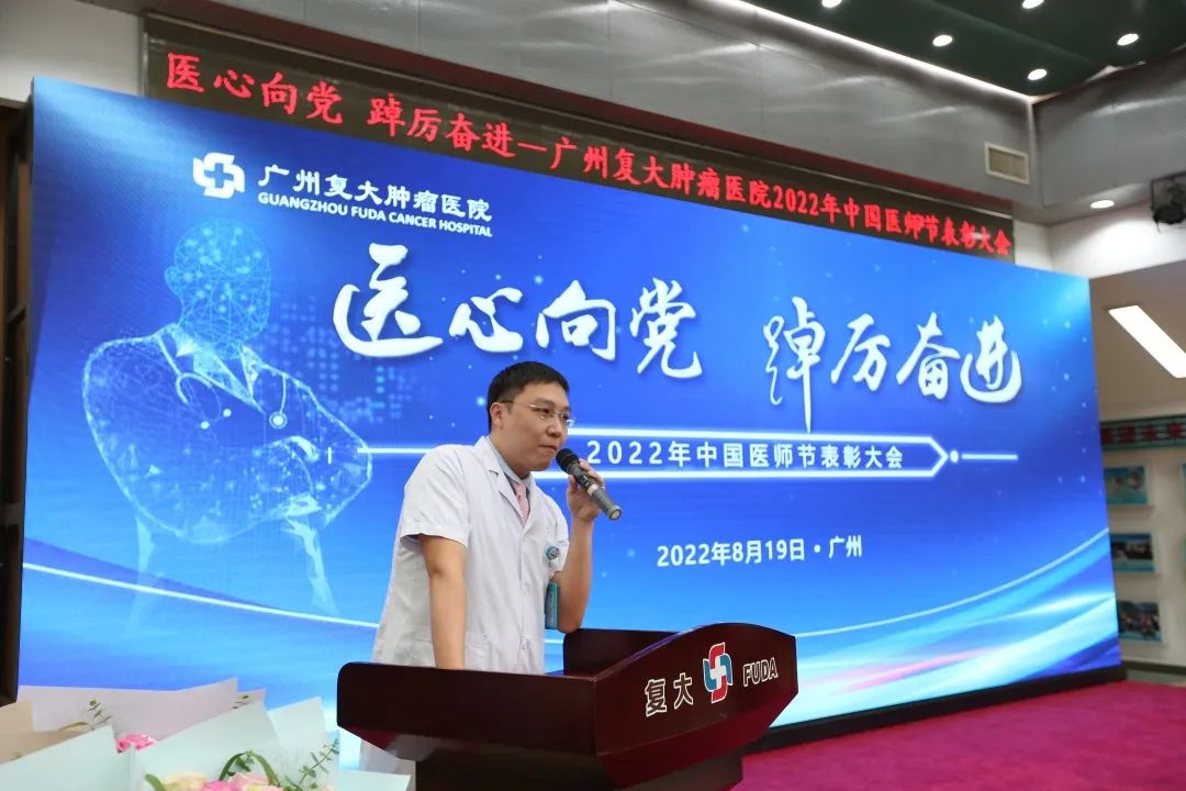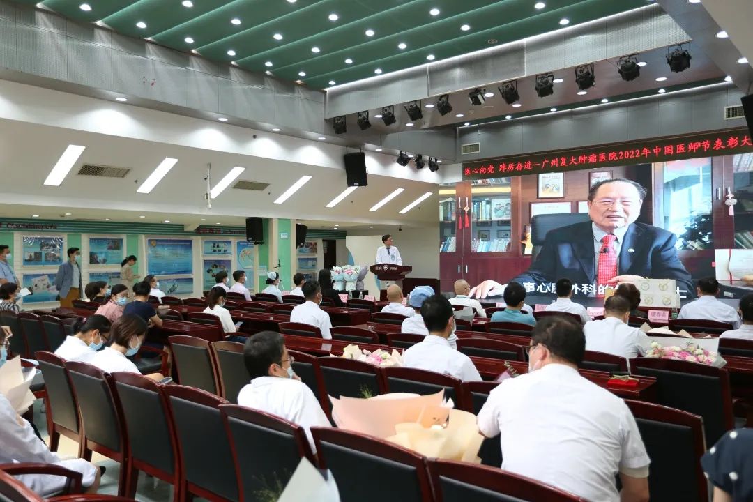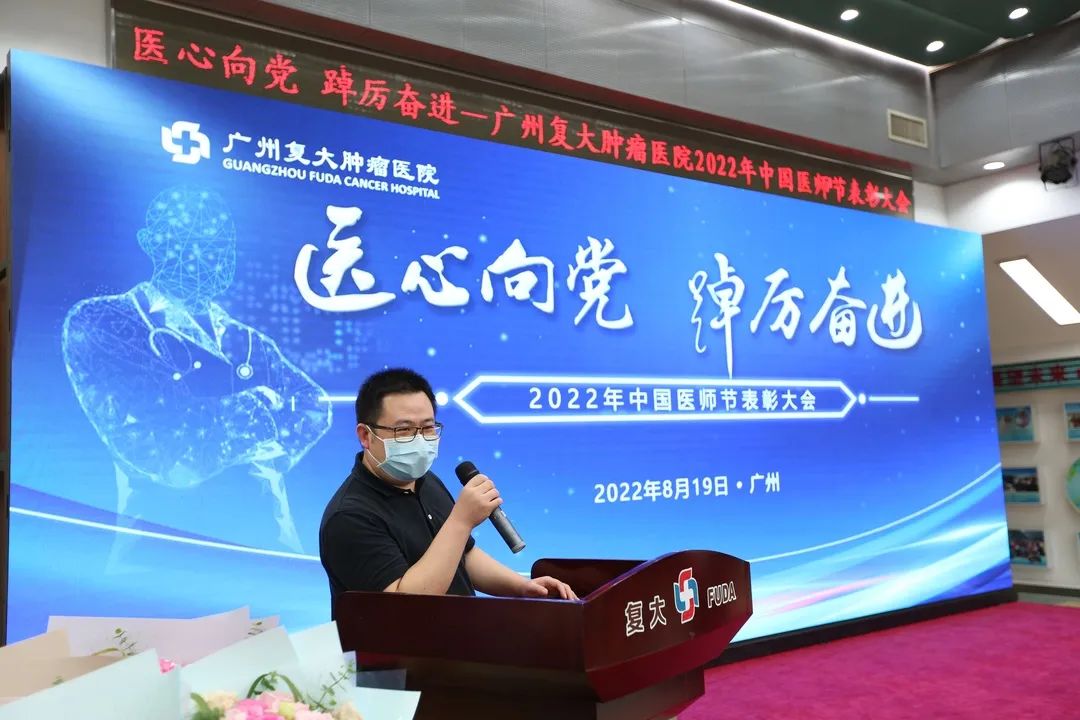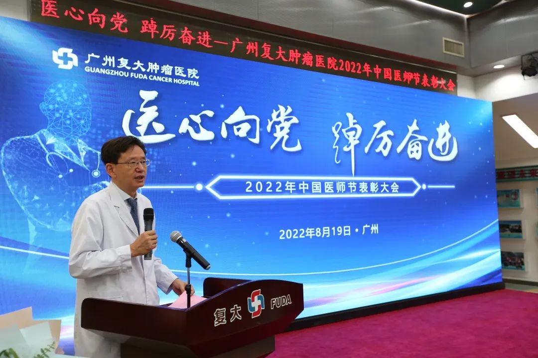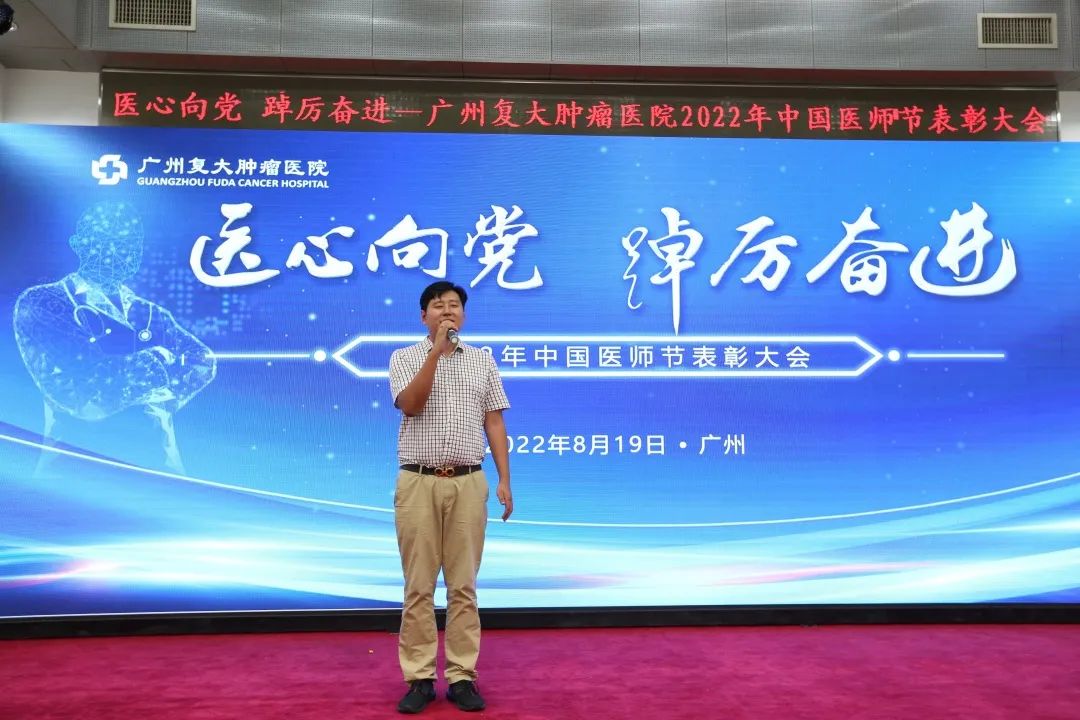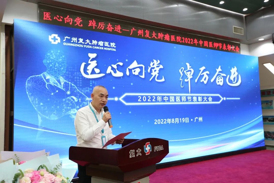 为迎接党的二十大胜利召开,弘扬崇高精神和伟大抗疫精神,激励广大医务人员崇尚先进、学习先进、争当先进,8月19日下午,我院在七楼会议室隆重举办“医”心向党、踔厉奋进——广州复大肿瘤医院2022年中国医师节表彰大会。郑洋总经理、牛立志院长、梁冰副院长出席会议并致辞,院领导班子、科室负责人及全院各科室医务人员代表欢聚一堂,共同庆祝自己的节日。会议由牛立志院长主持。