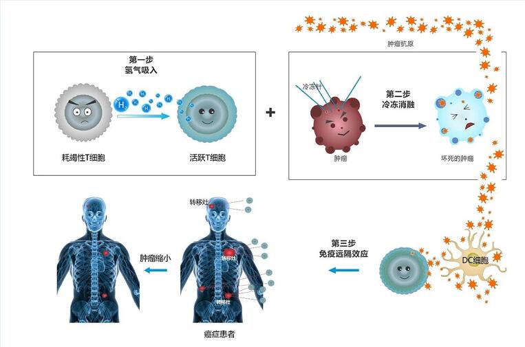 冷冻消除或不完全性消除目标肿瘤后,作为“情报细胞”的DC细胞(注:树突状细胞,人体内功能最强的抗原提呈细胞),虽然不能直接杀伤肿瘤细胞,但能通过识别肿瘤细胞特异性抗原,将其信号呈递给具杀伤效应的T细胞,激活、增殖的肿瘤特异性T细胞可以直接杀灭转移病灶。即,原发病灶冷冻消融后,远处转移病灶也消失了。