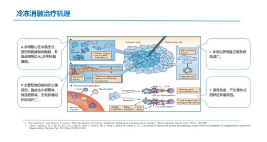 这可以称之为冷冻的远隔效应。为了增强效应,有必要对冷冻的过程进行改善。现在一般认为,能够引起远隔效应主要是坏死,而非凋亡。而冷冻冰球的中间部分引起的是肿瘤细胞坏死,冰球边缘引起的是细胞凋亡。冷冻的未来发展,应立足改进探针技术及超声技术,加上物理性辅助因子,以此产生更多坏死的区域,较少的凋亡区域。