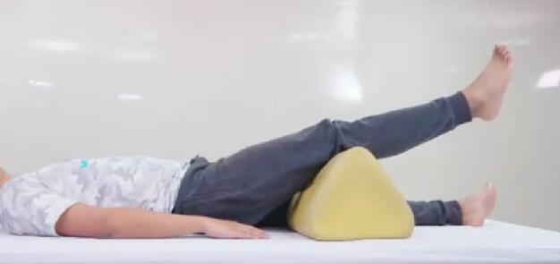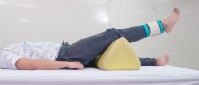 预备:仰卧位,膝下垫圆枕,踝关节处绑缚重物。