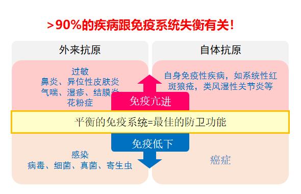当然,机体免疫功能的平衡是身体健康的保障。免疫功能过高,易患自身免疫性疾病;免疫功能低下,就易患感染性疾病或肿瘤。随着年龄增长,免疫功能会有逐年下降,这也是导致中老年易患各种疾病的原因。