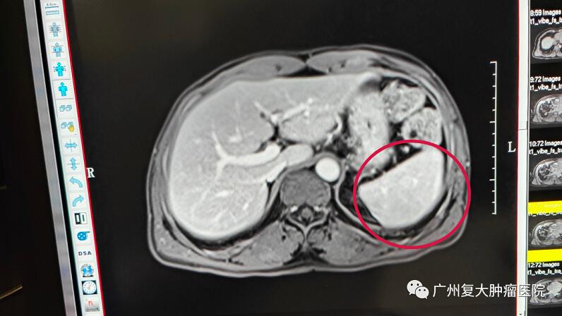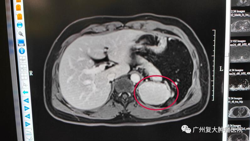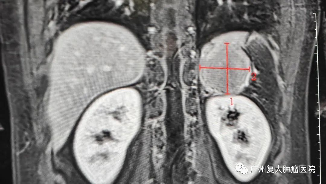 带着惴惴不安的心情,小伙子来到广州复大肿瘤医院就诊。入院后检查发现其彩超结果提示,左侧肾上腺区可见低回声肿物,边界清,内回声均匀,双肾血流灌注良好。为进一步诊断,小伙子又接受了上腹部MRI平扫+增强+DWI检查,脾脏缺如,脾脏术区可见大小约65×52×56mm团块灶,其内可见脾动静脉走行。