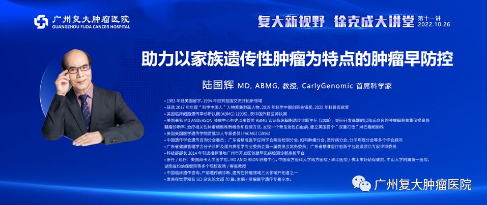 10月26日上午,我们有幸邀请到中国产前遗传病诊断、临床遗传咨询、遗传性肿瘤遗传咨询开拓者之一,2017年“科学中国人”年度人物(封面人物)陆国辉教授,在“复大新视野 徐克成大讲堂”第十一讲上为我们带来了《助力以家族遗传性肿瘤全程管理为特点的肿瘤早防控》主题分享。