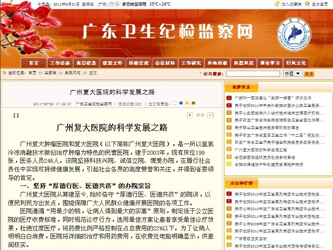 2011年8月29日,广东卫生纪检监察网在典型风范栏目发布了题为“广州复大医院的科学发展之路”的报道,现将报道转载如下: